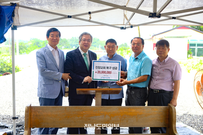 유난히 무더웠던 여름 폭염과 열대야로 이중, 삼중고를 겪고 있는 가운데 임시 예배 처소로 사용되고 있는 천막교회에서 진행된 전달식에서는 새로남교회에서 오정호 목사와 김용태 장로, 진양교회 허기녕 목사, 예장합동 함평노회장 이상백 목사, 복구위원장 서종석 목사 등이 함께 했다.